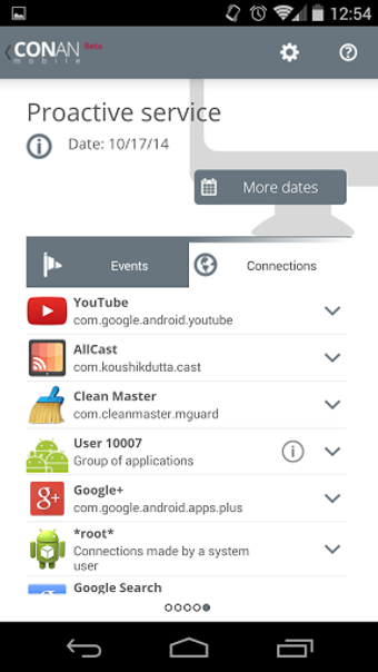 Además, CONAN cuenta con un servicio de "guardia" que registra en tiempo real si alguna app ha hecho algo sospechoso como modificar tu archivo Hosts, llamado a números de teléfono u otras actividades sospechosas.