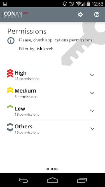 CONAN Mobile se centra en analizar tres apartados: la configuración, las aplicaciones y los permisos.